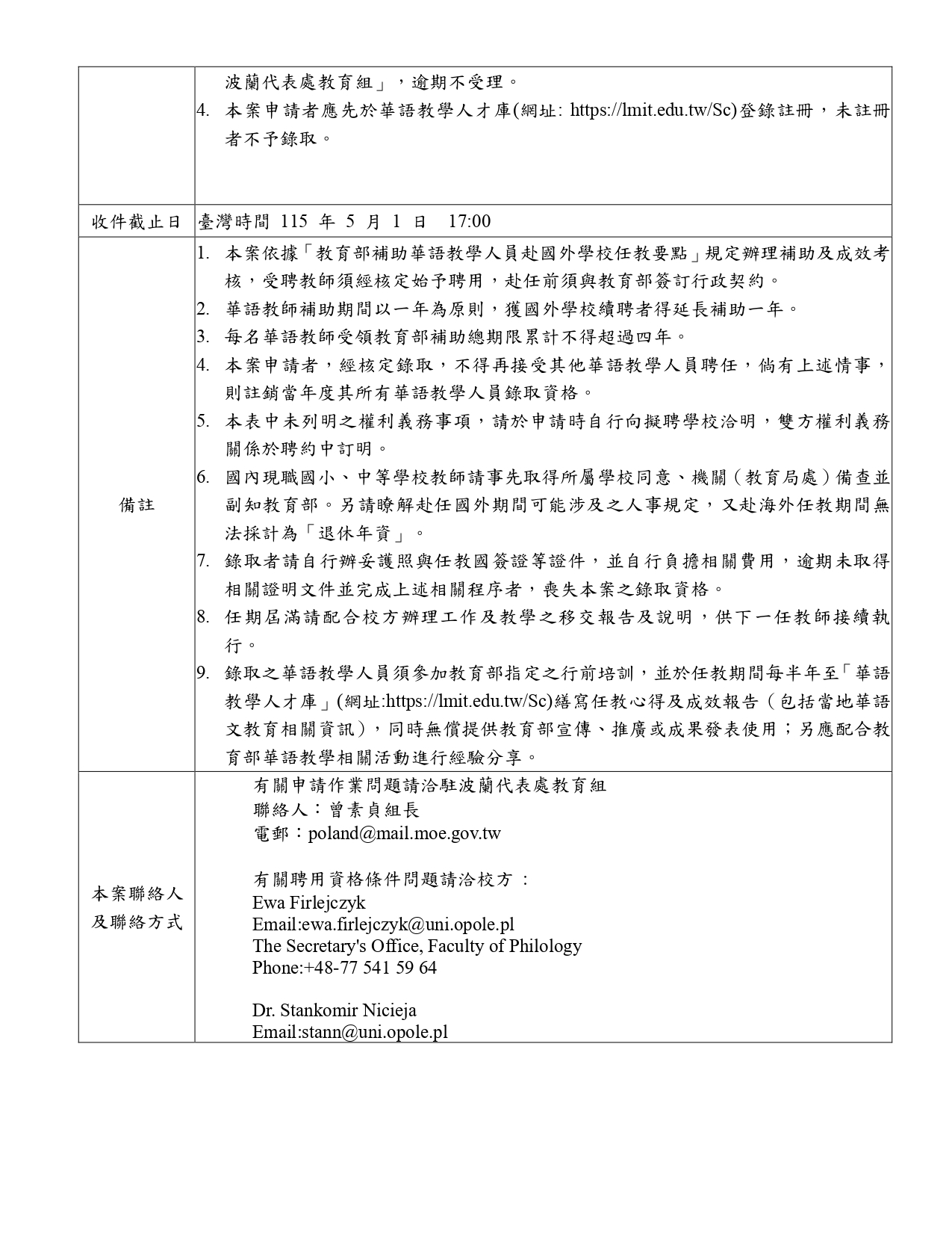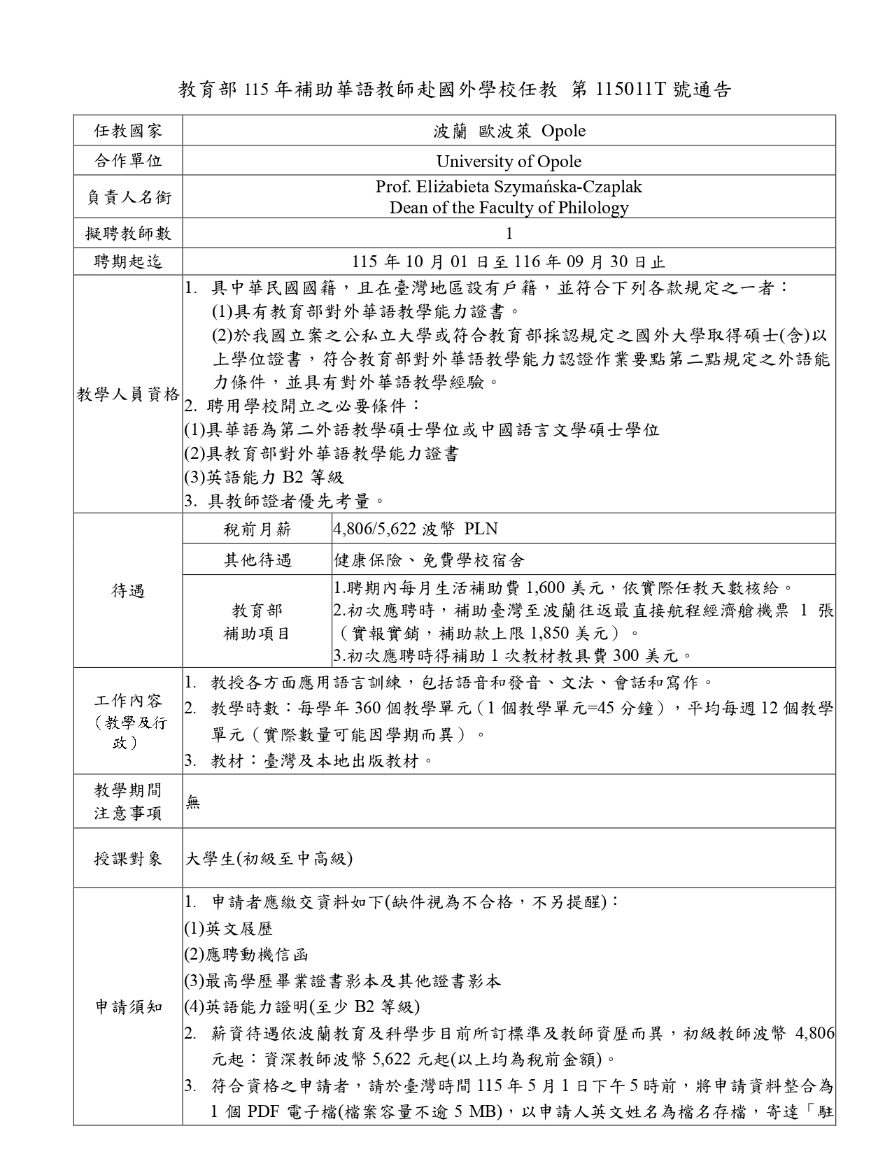 波蘭歐波萊大學(University of Opole)自115年10月1日起至116年9月30日止,徵聘1名教師