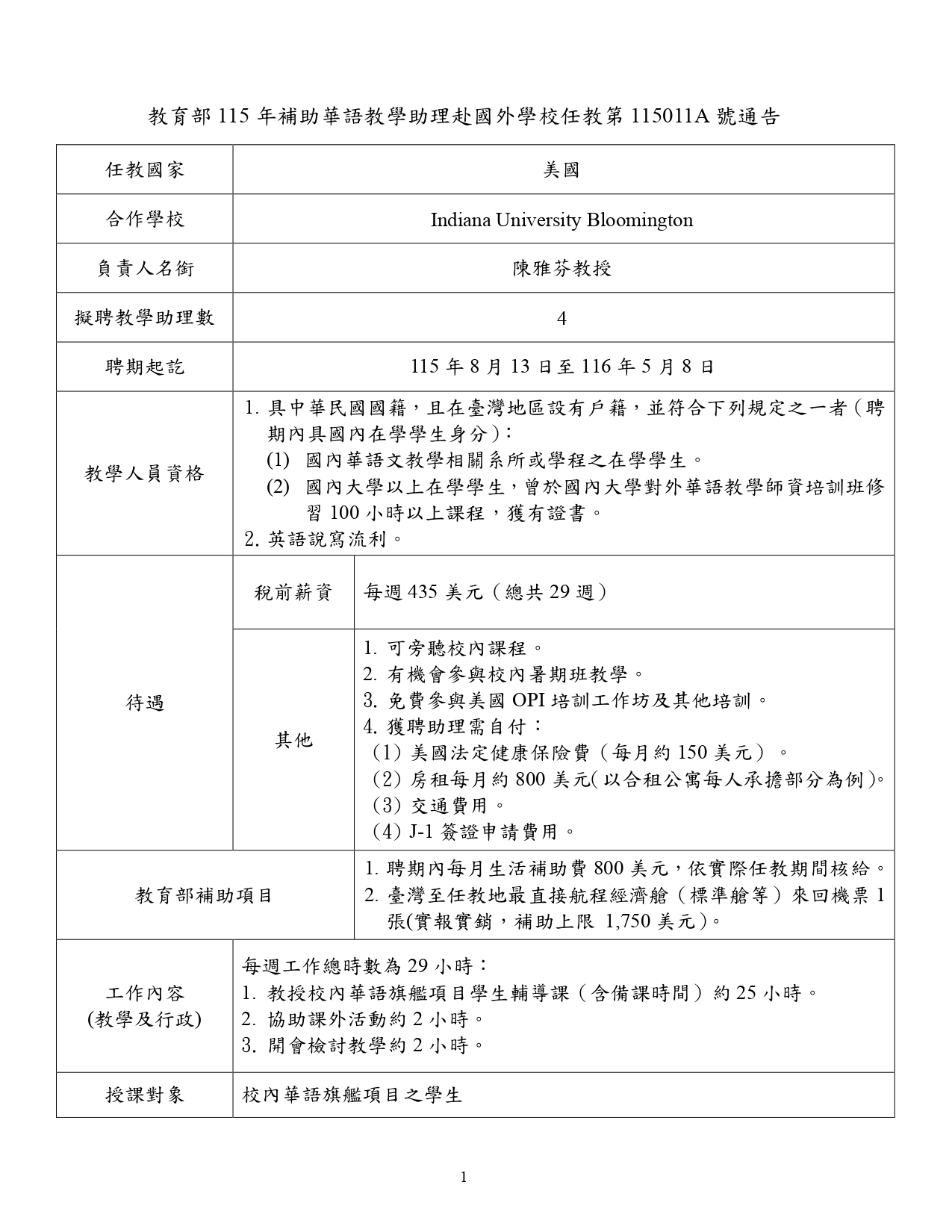 美國印第安那大學布魯明頓分校(Indiana University Bloomington)自115年8月13日至116年5月8日止,招聘華語教學助理4名