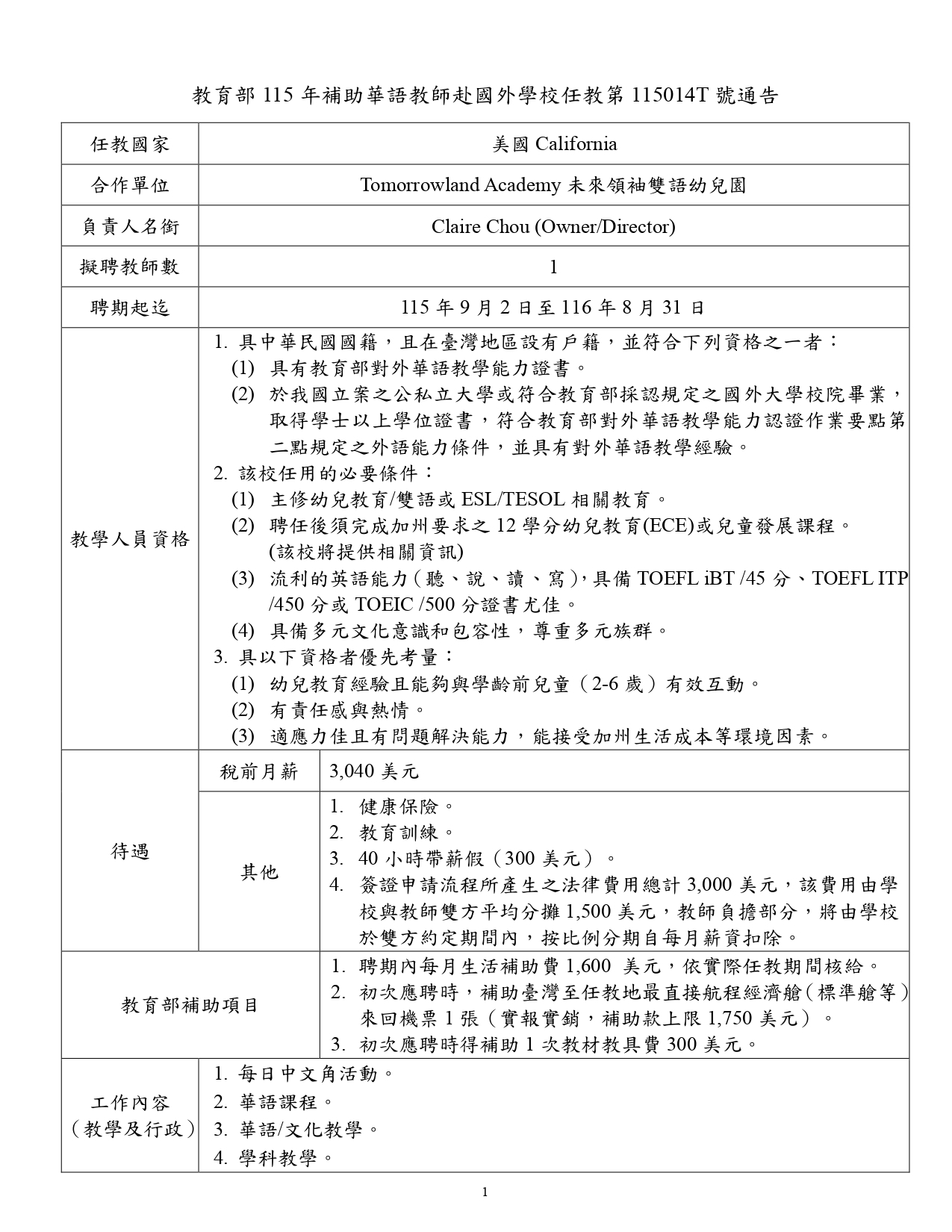 美國加州未來領袖雙語幼兒園(Tomorrowland Academy)徵聘華語教師1名